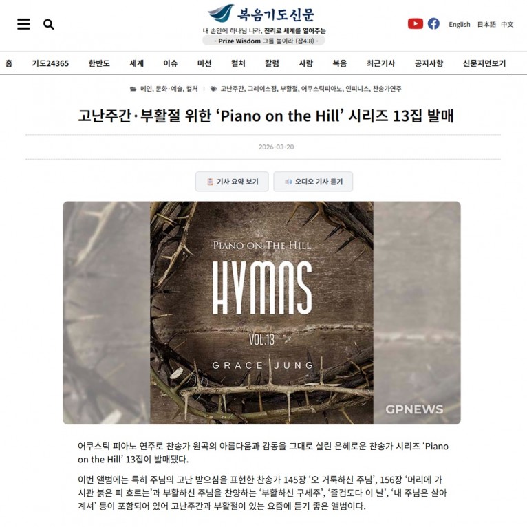[기사] 고난주간·부활절 위한 ‘Piano on the Hill’ 시리즈 13집 발매(복음기도신문)
