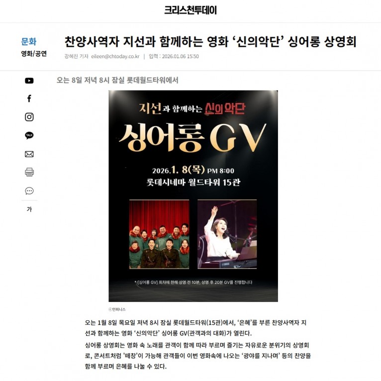 [기사] 찬양사역자 지선과 함께하는 영화 ‘신의악단’ 싱어롱 상영회(크리스천투데이)