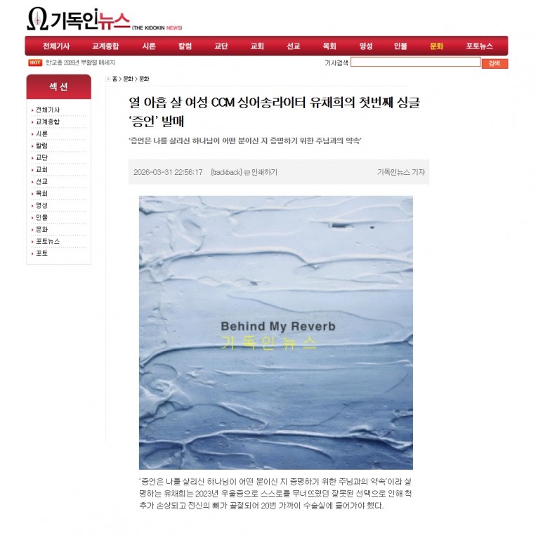 뮤직타임 [기사] 열 아홉 살 여성 CCM 싱어송라이터 유채희의 첫번째 싱글 ‘증언’ 발매(기독인뉴스)
