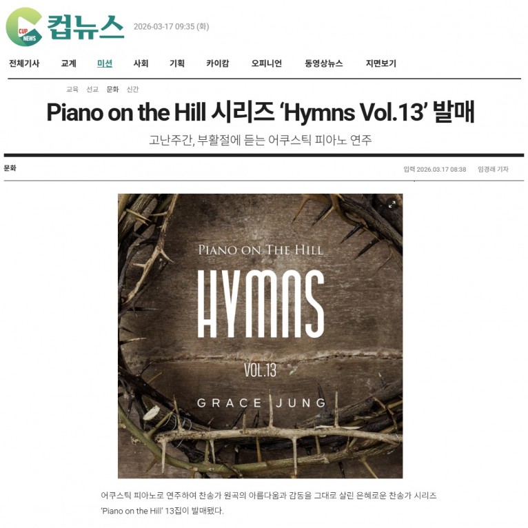 뮤직타임 [기사] Piano on the Hill 시리즈 ‘Hymns Vol.13’ 발매(크리스챤연합신문 컵뉴스)